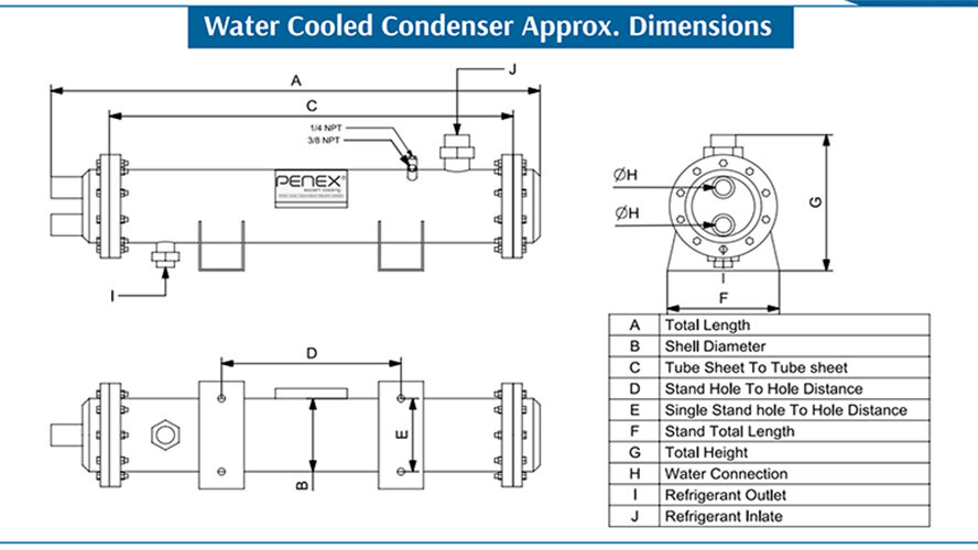The water cooled shell and tube condensers from PENEX have been a standard in refrigeration and air conditioning technology for 15 years due to their well-known reliability and performance. The PHCD series consists of two designs and thus meets the requirements of a wide variety of applications. The unique brazing process between tubes and tube sheets ensures excellent vibration stability and high safety in terms of tight-ness.